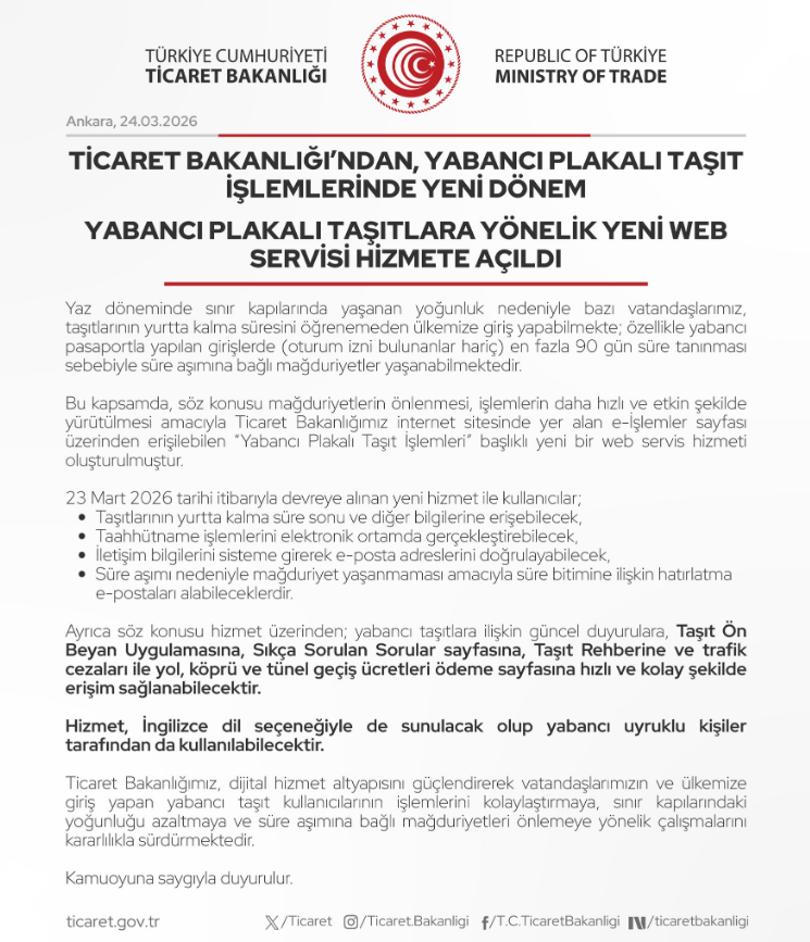 Sözkonusu mağduriyetlerin önüne geçilebilmesini teminen, Ticaret Bakanlığı'nın internet sayfasında (https://ypti.ticaret.gov.tr) yer alan e-işlemler sekmesinden erişilebilen "Yabancı Plakalı Taşıt İşlemleri" isimli yeni bir hizmet 23.03.2026 tarihinde devreye alınmıştır.